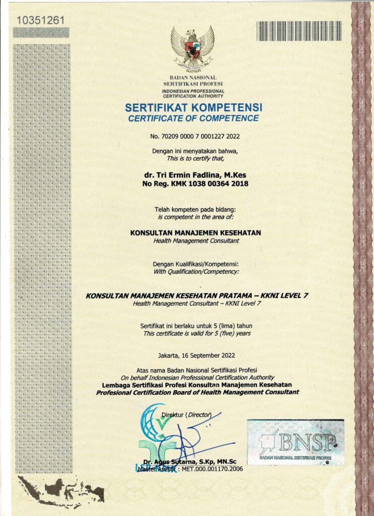 Kami didukung oleh tenaga ahli konsultan manajemen kesehatan profesional yang tersertifikasi BNSP dan berpengalaman dalam pengelolaan serta pengembangan layanan kesehatan